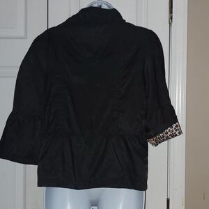 black nylon peplum jacket with 3/4 length bell sleeves and 2 button front closure.