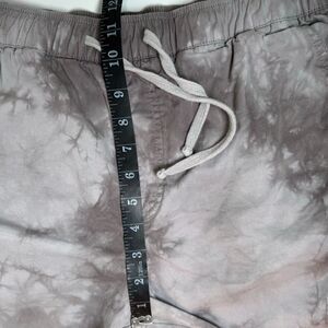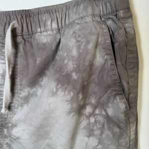 Katin Mens casual tie-dye shorts in size Medium. These laid-back shorts feature a gray tie-dye pattern, a comfortable elastic waistband with drawstring, and a cotton-spandex blend for ease of movement. Perfect for casual wear, beach days, or skate/surf lifestyle.