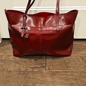 Kattee Leather Dark Lipstick Red Hand Bag with Two Carrying Straps, Front Zipped Pocket, Two Inside Slide Pockets, One Large Inside Zipped Middle Pocket, and One Inside Zipped Large Pocket. In Great Condition.