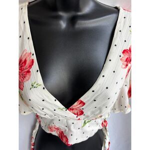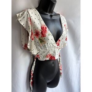 Katwalk NWT Polka Dot Ruffle Top Floral White Red Romantic Flutter Sleeve Size S