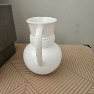 Gorgeous white small pitcher with elegant details. This classic piece would look beautiful styled on a coffee table with some flowers or in a kitchen on the countertop. This is such a cute gift for a housewarming or bridal shower.