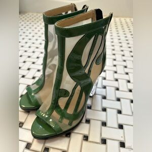 Elevate your style with these striking green and cream heels from Katy Perry Collections. Featuring a sleek design with cut-out details and a high, slim heel, these shoes offer a modern and sophisticated look. The combination of glossy green material and cream accents creates a bold yet elegant statement.