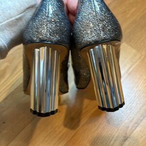 Tags: block heel, silver, holiday, christmas, glitter, pointed toe, holiday party, sparkle, glam, jingle, bells