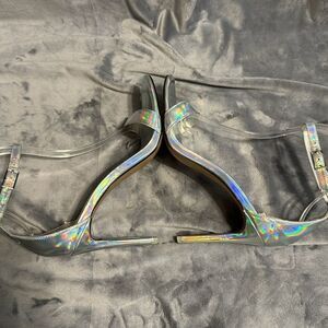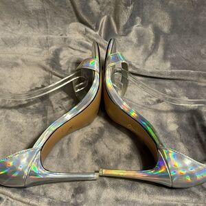 Shoes are photographing as rainbow hued, they are not. They are silver pearlescent. In very good condition, back of right shoe at the top of the heel shows some wrinkle/ peel of the top coating. You have to look really close to see it!