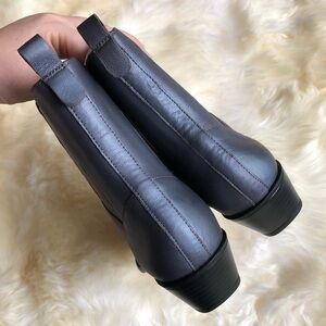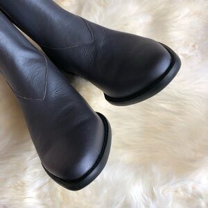 Western style. Almond toe. Back pull tab. Short chunky 1.5” heel. Dual gored shaft insets. Leather.