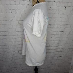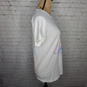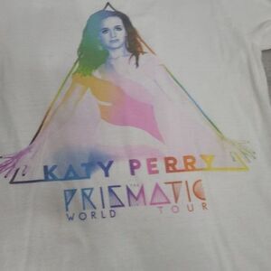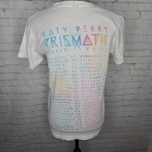 Pre-owned Katy Perry The Prismatic World Tour t-shirt. Years were 2014 and 2015. Cities from tour on back. Tag size small. Small hole at seam of neckline & very faint stain bottom front. Very mild pilling. Measurements are in photos double where needed.