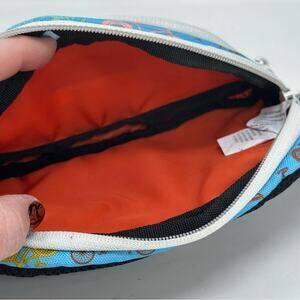 Item in Excellent Preowned Condition. No signs of use, Canvas and Polyester, Whimsical bike print, Two outside zip pockets, 1 interior compartment, Would fit a phone, keys and a small wallet, Large plastic clip closure.