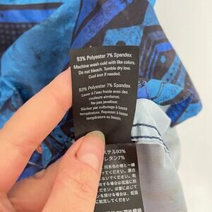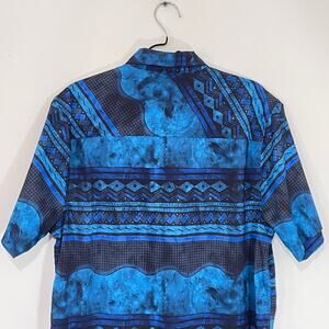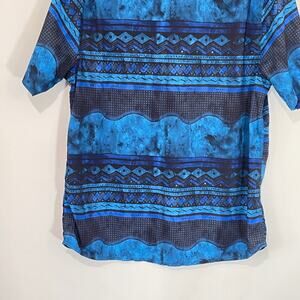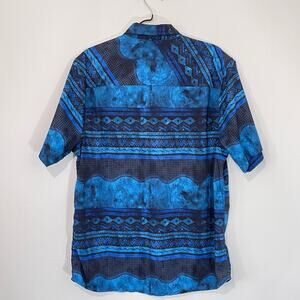 Kavu Button Up Shirt Mens Large Blue Wave/Multi Pattern, Short Sleeve, "Klear Above Visibility" Performance Top. Has chest pocket. Lightweight, "loud" windbreaker type fabric. Polyester and Spandex Blend. Like New Condition!!