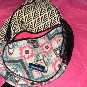 Chic Kavu sling bag with geometric patterns. Features pink, black, and cream design. Ideal for daily adventures.