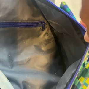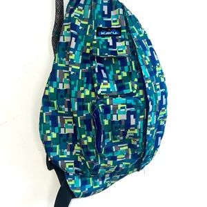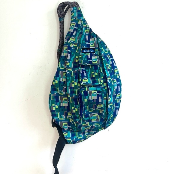 Kavu Geometric Rope Sling Nylon Block Print Backpack Crossbody Backpack EUC Green, Blue and Gray. This cute crossbody sling backpack features an adjustable rope shoulder strap with side release buckle to Velcro zip compartment and key or cell phone pocket in a padded bag with KAVU embroidery. Has two large zippered areas. It’s perfect for use around town, or the trail.