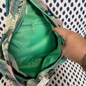 Rope Bag has one exterior zippered pocket and one exterior velcro pocket, plus one interior zippered pocket. It is in excellent condition with no rips or stains.