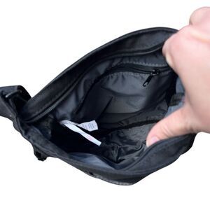 Simplify your daily routine with the Kavu Kicker Crossbody Purse, a versatile companion for the woman on the go. Crafted from a durable cotton blend, this medium-sized bag boasts a sleek black exterior with a complementary herringbone pattern and a subtle logo accent. It's designed with a secure zip closure and an organized interior lined in gray, featuring pockets to keep your essentials neatly arranged.