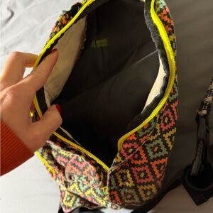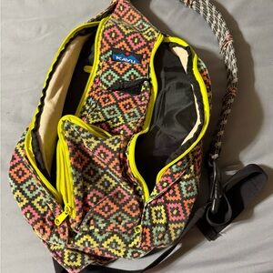 Has faded. Well loved. Zippers perfect! Strap and clasp are in good condition.