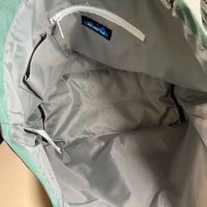 Stylish Kavu tote bag. Features green, brown, and cream panels. Patterned straps for easy carrying. Perfect for daily use. Clean inside