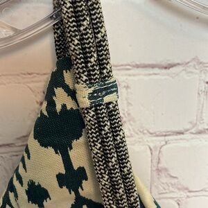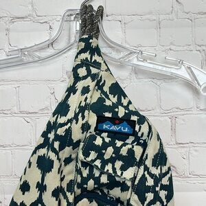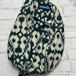 This cotton canvas sling features an adjustable rope shoulder strap with side release buckle, two vertical zip compartments, two key or cell phone pockets, and a padded back with KAVU embroidery.