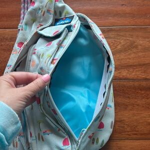 Cute Kavu sling backpack bag. 2 large zippered compartments, one smaller zippered compartment and one Velcro compartment down middle. Very clean interior. Light blue with camper, surfboard, and sunset images. Rope and adjustable strap in very good condition, as pictured. Light debris and wrinkling on exterior, as pictured. Overall very good used condition.