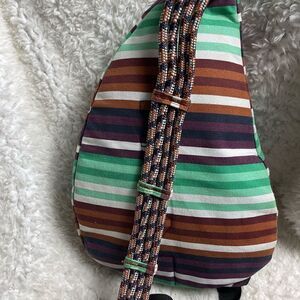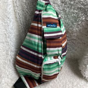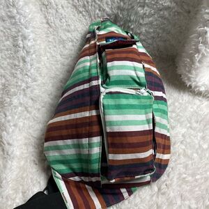 Kavu sling back/ crossbody bag Canvas stripes Aztec color padded back .two front pockets with zipper and Velcro closure two side zipper compartment.adjustable back strap.pre owned in good used condition clean normal wear.see all pictures any questions please message.M8