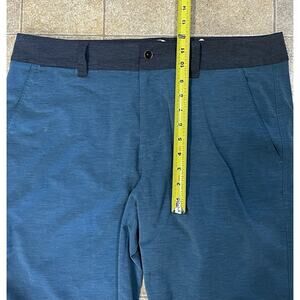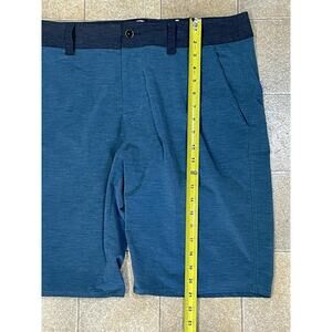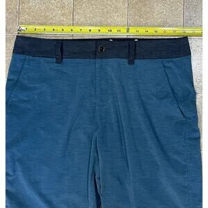These Kavu shorts are designed for men in size 36 with a solid pattern in green and gray colors. They feature a button and zip closure, flat front design, and a mid-rise fit. Made from a breathable knit fabric blend of polyester, nylon, and cotton, these chino-style shorts are suitable for outdoor and casual occasions. The lightweight shorts have multiple pockets for convenience and are machine washable for easy care, making them ideal for travel and outdoor activities.