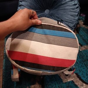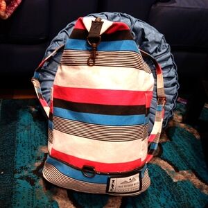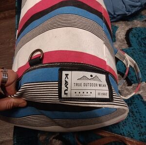Stylish and durable, the Kavu striped backpack is perfect for everyday use. Featuring vibrant red, blue, and black stripes, this bag combines functionality with a bold design. Ideal for carrying essentials with ease and flair.