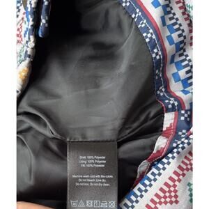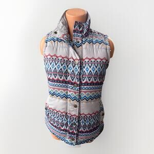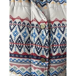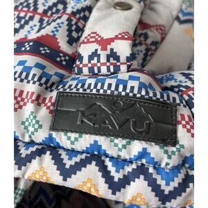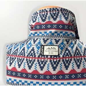Pit to pit 19. The Kavu Women's Puffer Vest in size S is designed for outdoor activities like hiking, featuring a stylish Fair Isle pattern and a snap button closure. Made with a soft polyester shell and filled with polyester insulation, this lightweight vest is perfect for the winter and fall seasons. The multicolor design adds a fun and versatile touch to your travel or casual outfits, while the KAVU brand ensures quality and style in your wardrobe.