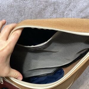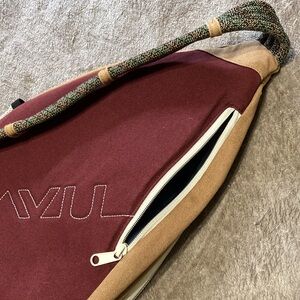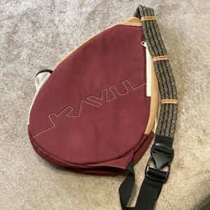 Kavu backpack with one adjustable strap. 2 outer pockets and one on the inside- see pics. All zippers work. Small stain on the front but otherwise perfect condition. Great for travel or the person that likes to be hands free!