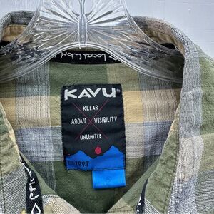 Experience comfort and style with the KAVU Men's Green Plaid Shirt. Perfect for casual outings, this shirt features a classic plaid design in green and tan. Ideal for any wardrobe.