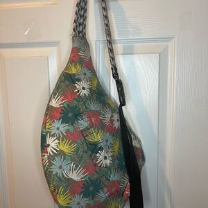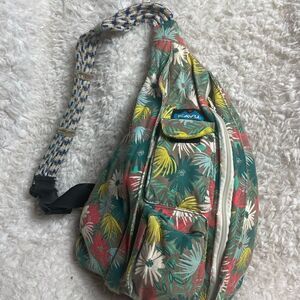 Kavu Rope canvas sling back multi color tropical prints two small front pocket two side zipper compartments the main compartment has a side zipper.Pre owned in good used condition normal wear no tear clean see all pictures any questions please message.M8