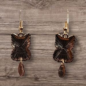 cat earrings, enamel earrings, kawaii jewelry, black and white cat earrings, quirky earrings, animal jewelry, novelty earrings, gold-tone dangle earrings, cute gift idea, fish hook earrings