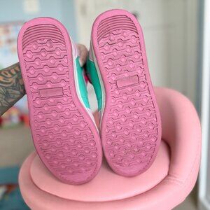 Dinoooo sneakers! Pastels! KawaiiiiI! I love the pink and mint color palette of these sneakers sm sm. These sneaks are super comfy and look cute with everything. The dinosaur is removable, although I don't know why you would wanna take that lil cutie off. He is velcroed on- no issues with him falling off ever. I am including all of my little monsters on the laces because they look cute with these shoes in particular, but they are also removable if you don't like them.