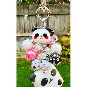 This handcrafted keychain showcases sparkly/shiny pink, black & white beads throughout, along with super cute heart/paw beads & a kawaii panda charm!