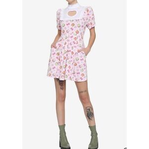 Nothing says "kawaii" like pink and macarons! This soft and stretchy pleated dress features an allover print of animal shaped macarons, bows and fruit. Heart shape cutout on bib, ruffle trimming on neck with back hook-and-eye closure and pockets. Back zipper closure.