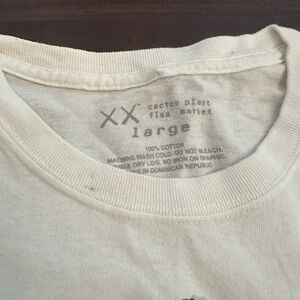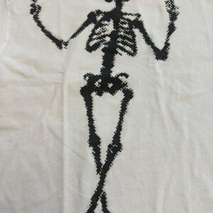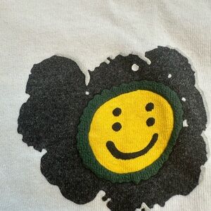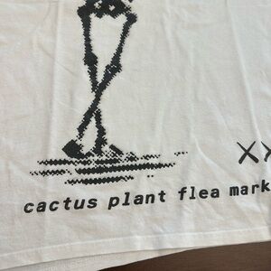 Designed in partnership with streetwear brand, Cactus Plant Flea Market, this white T-shirt from KAWS is highlighted by a black Companion Skeleton with a Cactus Plant Flea Market smiley face covering the face of the skeleton. Its design is crafted from cotton and features a straight cut.