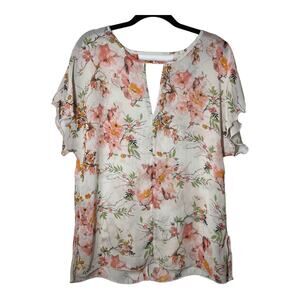 Kay Celine Floral Blouse Top Cut out Sheer Short Sleeve Medium V-Neck