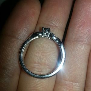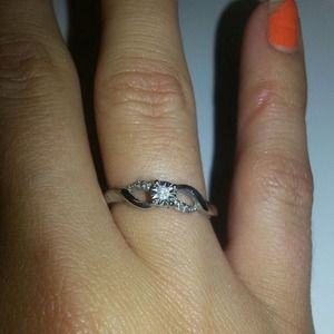 This wonderful diamond promise ring is a sterling silver, and round-cut. The sizing is true to size, which is a 7 ring size. The diamonds dance on either side of the major diamond. Does have some wear on the back from wearing it 24/7. Does also come with the matching box. I'll be selling this piece for $60, with possibly some shipping fees. Subtle yet sexy item!