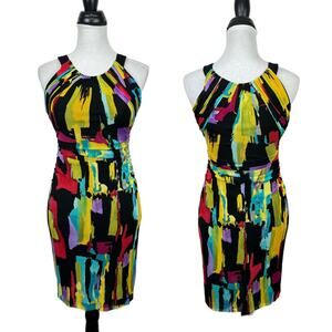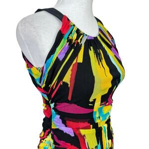 Kay Unger Black Colorful Brush Stroke Artsy Print Sleeveless Mesh Bodycon Dress