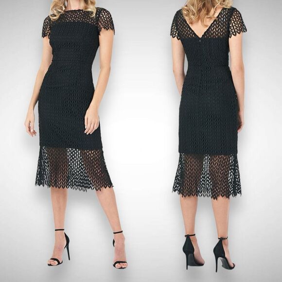 Kay Unger Black Tatum Floral Lace Sheath Midi Dress Size 10 Cocktail Effortless