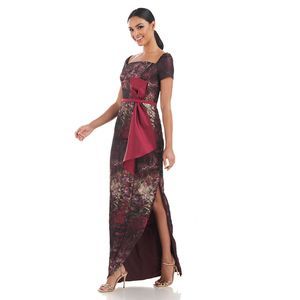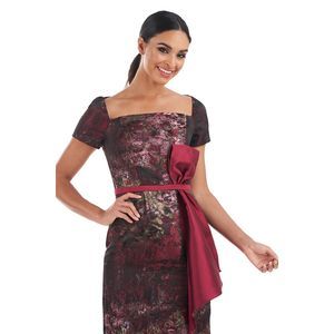 Framed by a square neck, it features a bow sash at the waist, and high slit at the tulip hem.
