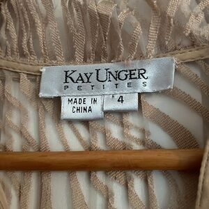This is a Kay Unger dress that is petite and size 4. It is a beige color and is sheer on top but has a built in champagne colored piece that is attached underneath. It has a sash that can be tied or taken off. Good used condition!