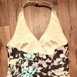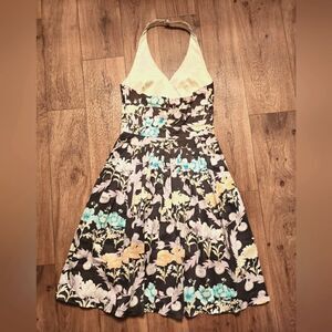 Great preloved condition. Kay Unger Floral Halter Pleated Dress Brown Cream Size 4. 96% Cotton and 4% Spandex. Back zipper. Pleated bottom. Bust Measurements laying flat is 16 inches. Waist is 14 inches. Length is 32 inches measured from the center of top to to hem. Pls see pictures for details. Thank you