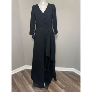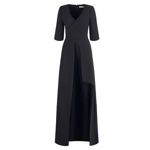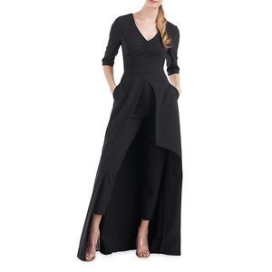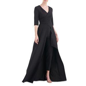Crafted of stretch-crepe, the Gina gown by Kay Unger is designed in a walk-through style with tailored pant legs layered underneath a floor-length skirt.