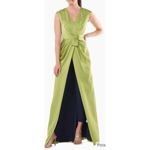 Crafted of stretch charmeuse, this jumpsuit from Kay Unger is styled with an attached abstract bow, surplice neck, and a gathered overskirt.