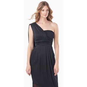 Stretch charmeuse, one shoulder with sash, shirred bodice and skirt, asymmetrical hem with fringe dress.