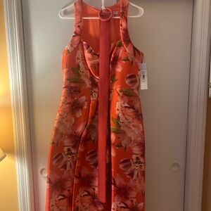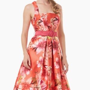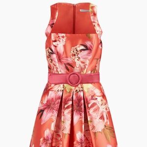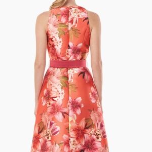 Printed mikado, halter, square neck, detachable belt, pleated t-length skirt with pockets.