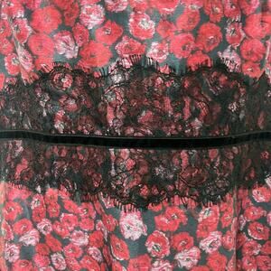 Fit and flare cocktail dress by Kay Unger of New York. It is lined with black polyester, and the outside is a deep red floral print on black with black lace top and sleeves and 3 more wide bands of lace down the dress. The band of lace at the waist is accented by black velvet ribbon. The back has a V neckline with a hidden zipper. The original retail price of this dress was $575 at a wedding shop.