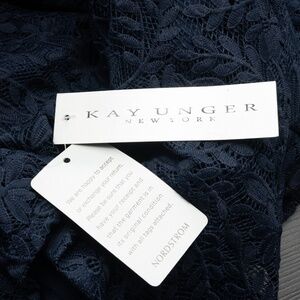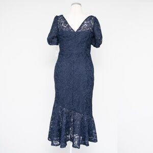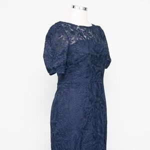 Refined and romantic, the Kay Unger Portia midi dress is crafted from rich navy floral lace with a delicate sheer yoke and short sleeves. The fitted bodice flows into a feminine trumpet hem with subtle transparency at the flounce, creating graceful movement with every step. Finished with a concealed back zip and full lining for comfort, this timeless piece is perfect for weddings - mother of the bride, cocktail parties, and elegant evening occasions.