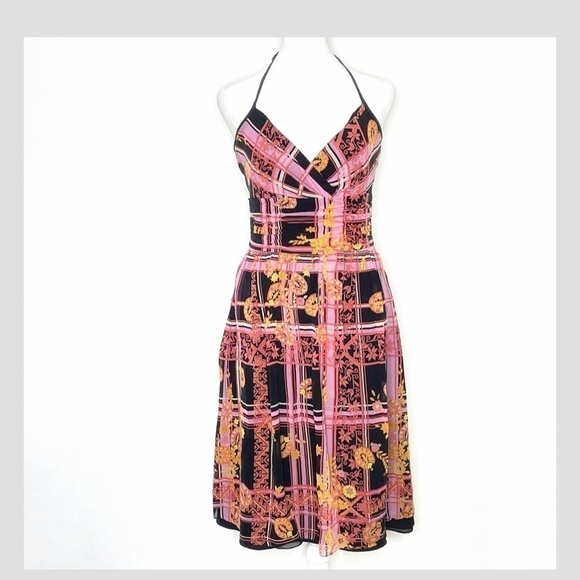 Kay Unger Silk Pin Up Style Halter Top Mid Length Cocktail Occasion Dress Abstract Print Black Dusty Pink Size 4