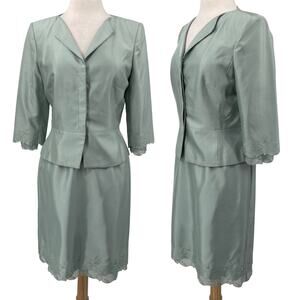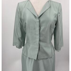 Keywords: kay unger silk skirt suit luxe feminine matching set mint green polished dainty delicate pretty tailored pencil skirts luxe chic elegant office classic silhouette embroidered flowers floral embroidery light colors timeless tailored pastels pastel green suits sophisticated silky vintage style blazers career slow fashion peplum versatile designer sophisticated church career modest vintage style retro