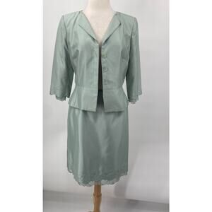 Kay Unger Silk Skirt Suit Set Embroidered Floral Semi Sheer Trim Mint Womens 8