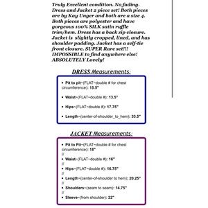 Truly Excellent condition. No fading. Dress and Jacket 2 piece set! Both pieces are by Kay Unger and both are a size 4. Both pieces are polyester and have gorgeous 100% SILK satin ruffle trim/hem. Dress has a back zip closure. Jacket is slightly cropped, lined, and has shoulder padding. Jacket has a self-tie front closure. SUPER Rare set!!! IMPOSSIBLE to find anywhere else! ABSOLUTELY Lovely!