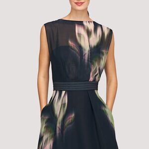 The Kay Unger Tess A-Line Chiffon Abstract Print Designer Evening Gown Size 4 is a stunning black floral-patterned dress made of polyester chiffon. This sleeveless gown features a zip closure and is designed for parties or cocktail events. The long A-line silhouette and lined interior make it a sophisticated choice for summer, fall, or spring formal occasions. MSRP $398.00